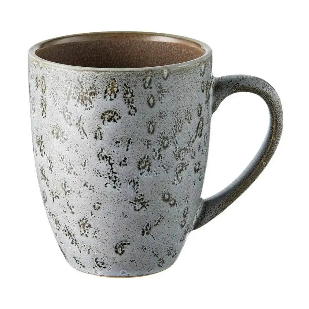 Kruset med hank fra Bitz er designet i holdbart stentøj, hvor den matte grå yderside mødes af en blank inderside.