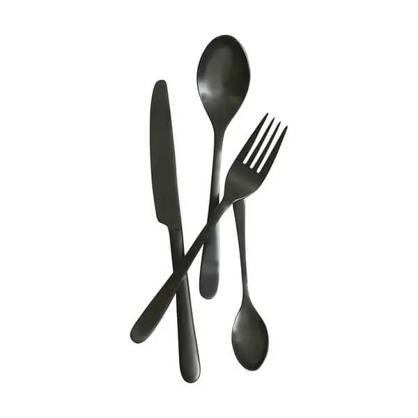 Du får 1 bestikæske med 4 spiseknive, 4 gafler, 4 teskeer og 4 spiseskeer i rustfrit stål.