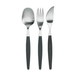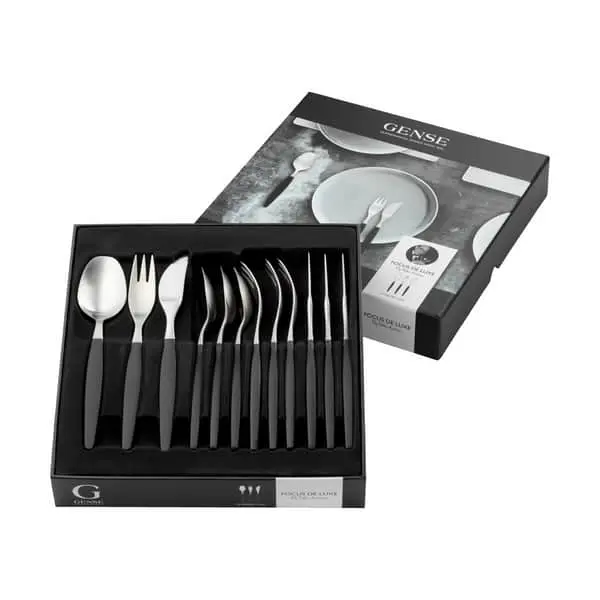 Designklassiker Smuk sort og mat stål Bestiksæt med 12 dele