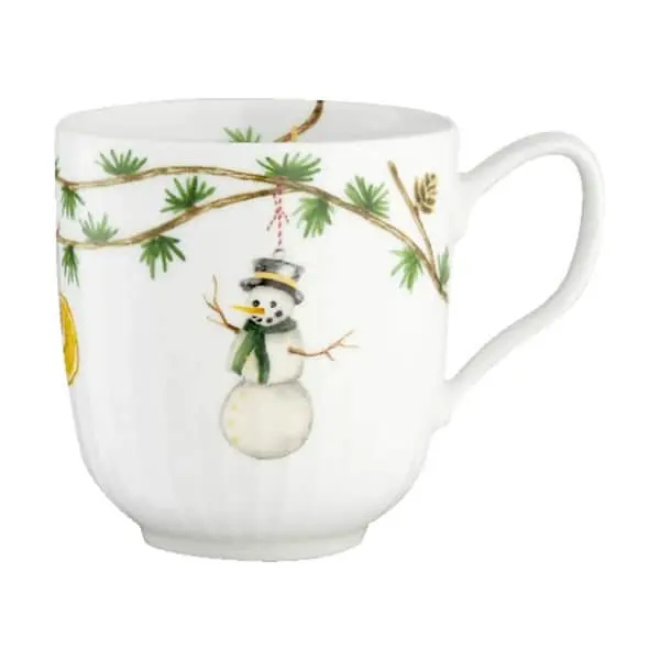 Kruset fra Hammershøi Jul emmer af varm julestemning. På den grønne lærkegren hænger julestjerner, snemænd og tørrede appelsiner – alle motiver som leder tankerne tilbage til barndommens jul. Hold varmen gennem hele december med krydret gløgg, varm chokolade eller et krus morgenkaffe.