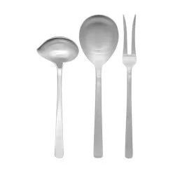 Serveringssættet består af en stegegaffel, en serveringsske og en sauceske. Serveringssættet leveres i en unik Kay Bojesen bestikpose i 100% bomuld.
