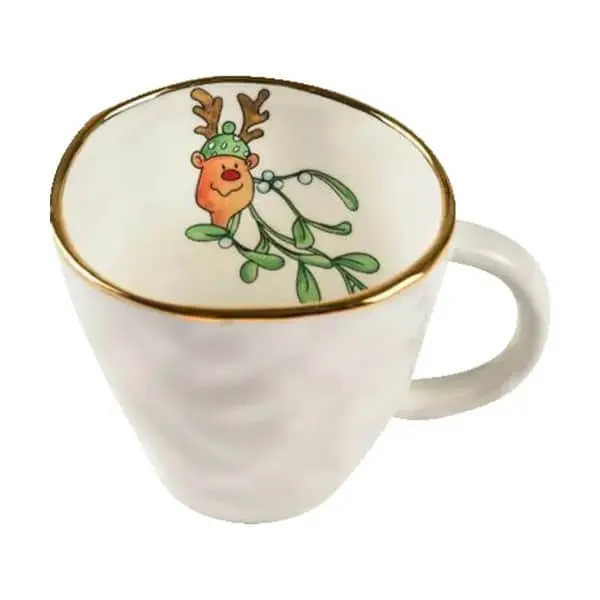 Julens godter serveres flot i stellet fra Medusa Copenhagen. Kruset med hank er dekoreret med dejlige tegninger af et rensdyr og mistelten, og kanten er gylden.
