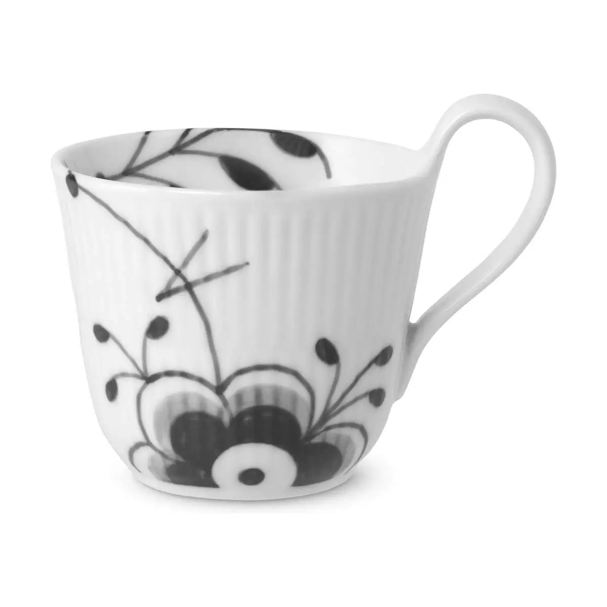 Royal Copenhagen Sort Mega Riflet højhankskoppen prydes af to håndmalede blomster i form af en palmette og krysantemum, der i deres monokrome enkelthed skaber et iøjefaldende udtryk mod det hvide porcelæn. Den klassiske og karakteristiske kop er perfekt til en kop kaffe eller te.