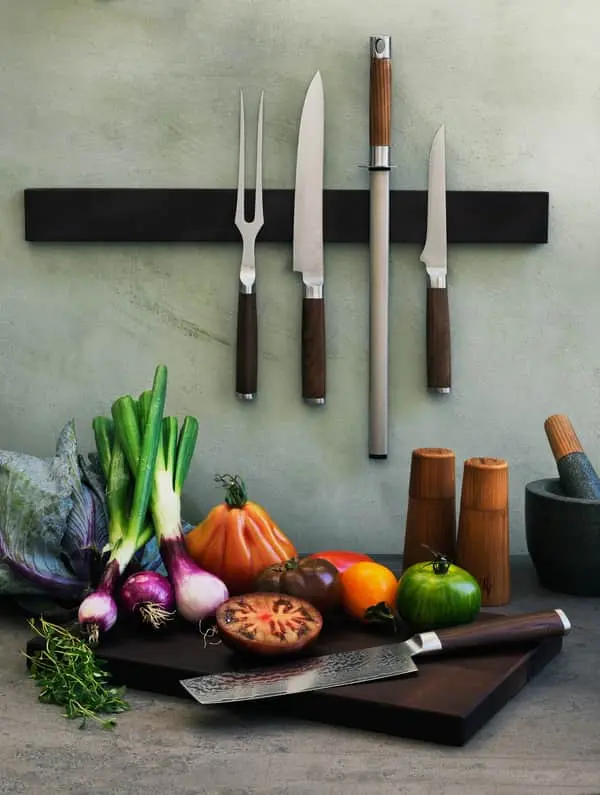 Sættet består af en kokkekniv og en stegegaffel. Knivens blad, som er i 67 lag damaskusstål, skærer smidigt igennem kødet. Og gaflens gode håndtag ligger godt i hånden og holder styr på stegen, mens du skærer.