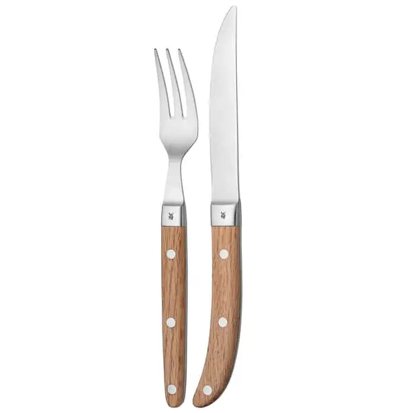 Når menuen står på saftige bøffer, er det frem med Ranch steakbestikket fra WMF. Steakbestikket er skarpt og fremstillet i Cromargan® rustfrit stål med et nittede skaft i egetræ, så du let og elegant kan nyde de lækre bøffer til sommerens mange grillfester.